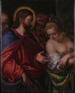 Allora gli scribi e i farisei gli conducono una donna sorpresa in adulterio e, postala nel mezzo, gli dicono: "Maestro, questa donna è stata sorpresa in flagrante adulterio. Ora Mosè, nella Legge, ci ha comandato di lapidare donne come questa. Tu che ne dici?". Questo dicevano per metterlo alla prova e per avere di che accusarlo. Ma Gesù, chinatosi, si mise a scrivere col dito per terra. E siccome insistevano nell'interrogarlo, alzò il capo e disse loro: "Chi di voi è senza peccato, scagli per primo la pietra contro di lei". E chinatosi di nuovo, scriveva per terra. Ma quelli, udito ciò, se ne andarono uno per uno, cominciando dai più anziani fino agli ultimi.